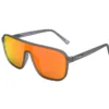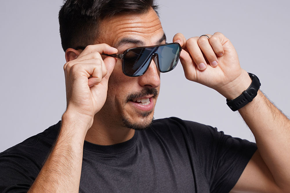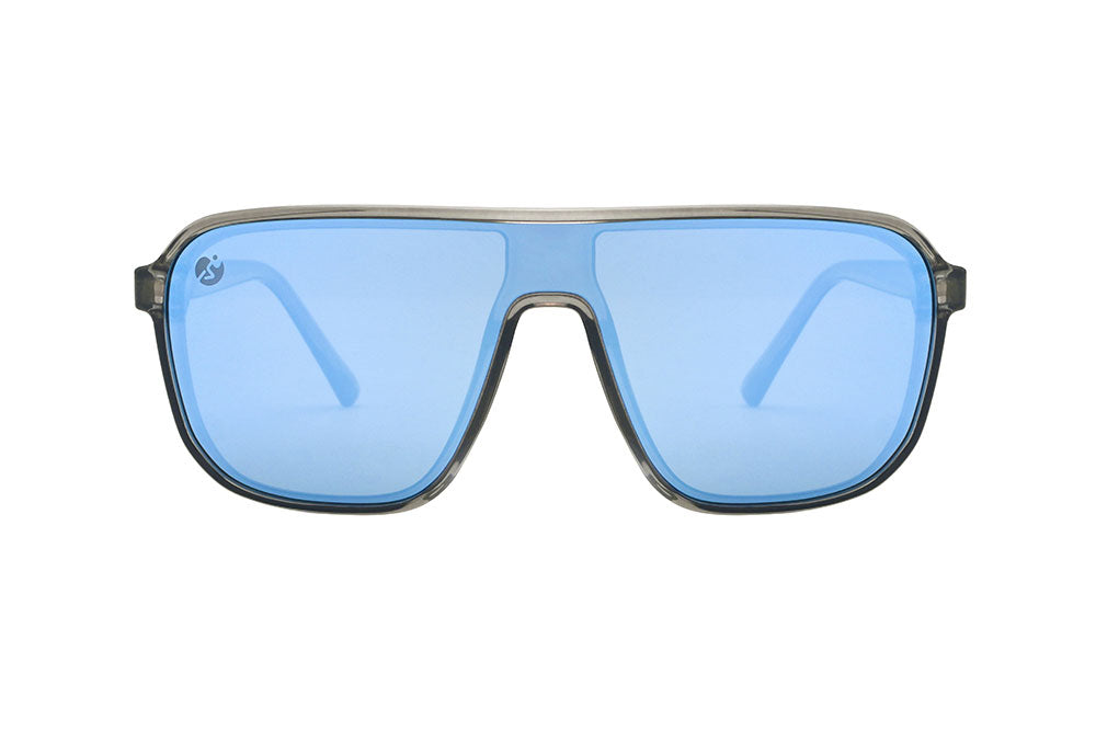 Capital style, infinite views. Translucent grey frames with sky blue mirror lenses