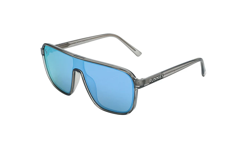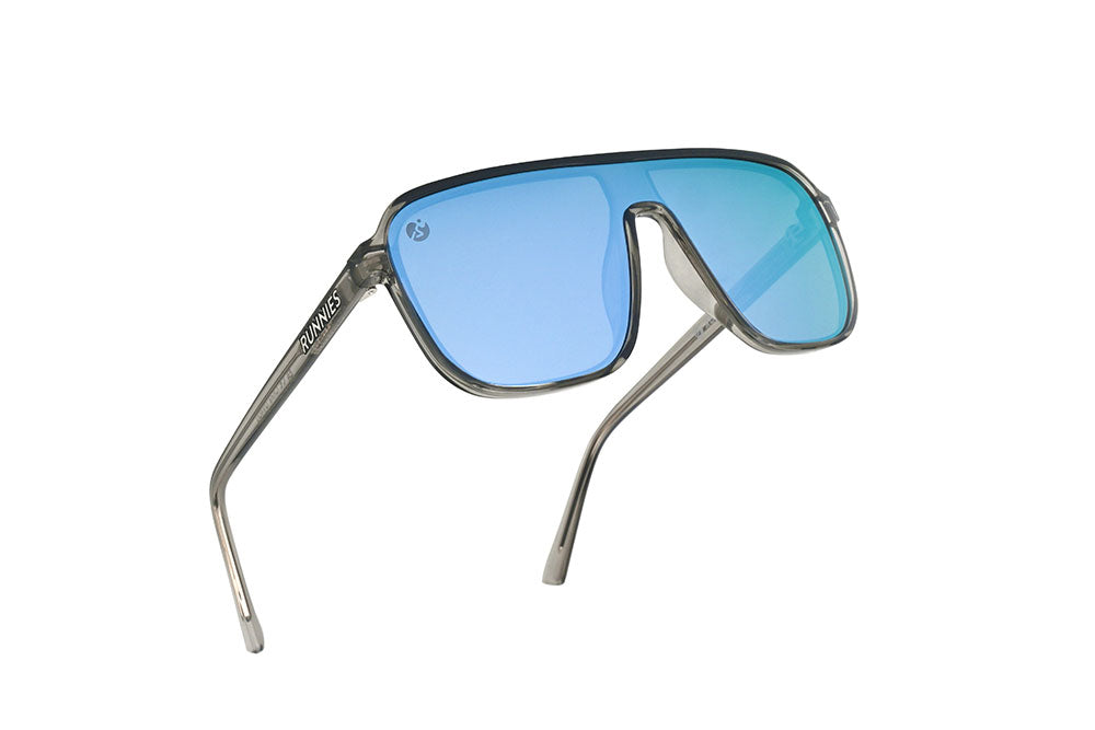 Capital style, infinite views. Translucent grey frames with sky blue mirror lenses