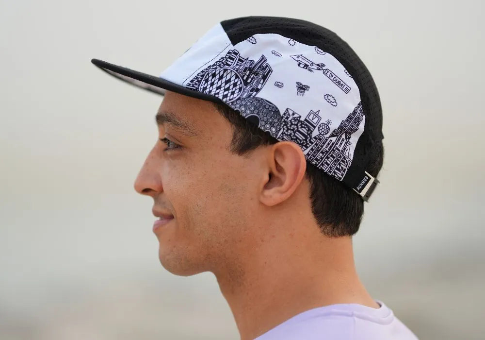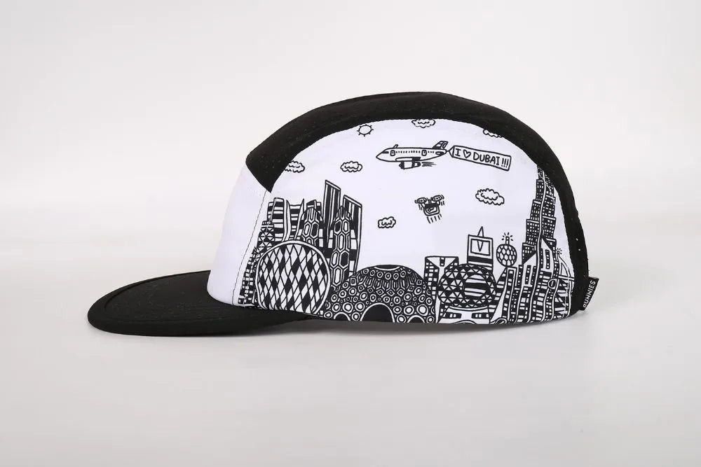 Abdulla Lutfi is a talented artist and person of determination whose unique perspective on Dubai has captured hearts across the UAE. His intricate line drawings showcase not just technical skill but a joyful interpretation of the world around him. The Dubai skyline featured on this hat includes his signature elements – recognizable landmarks mixed with playful additions like planes spelling “I Love Dubai” and whimsical drones dotting the sky. This collaboration represents more than a product; it’s a platform for Abdulla’s art to inspire runners worldwide while generating meaningful income and recognition for his work. Every hat sold directly supports Abdulla’s artistic journey.