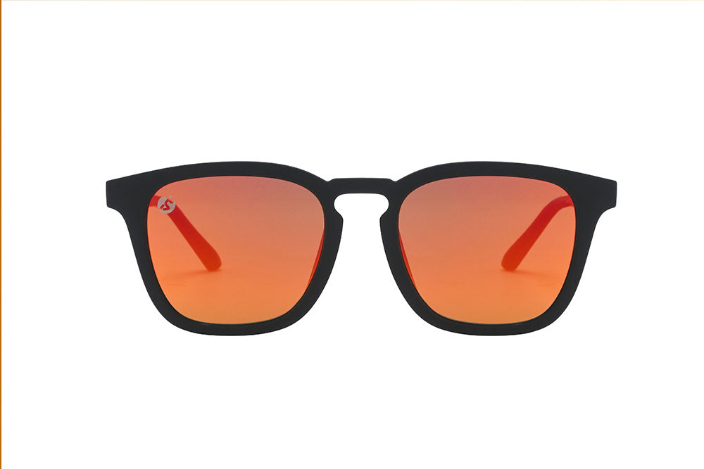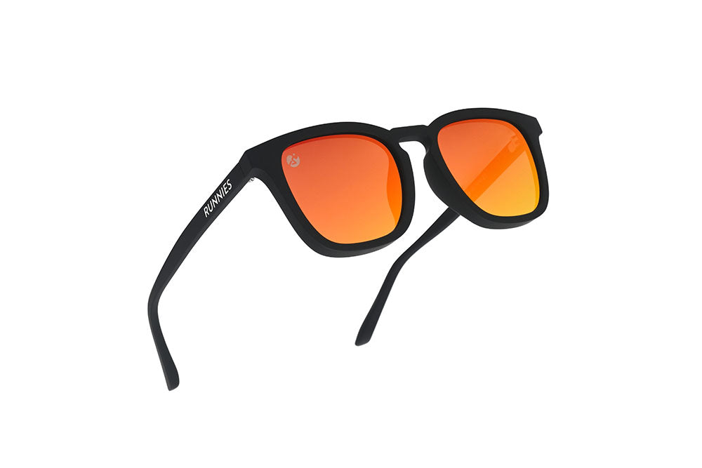 Precision meets power. Matte black frames with sunset orange mirror lenses