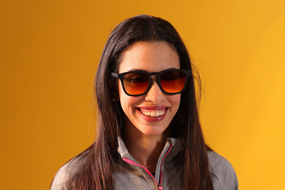 Precision meets power. Matte black frames with sunset orange mirror lenses