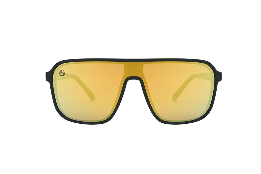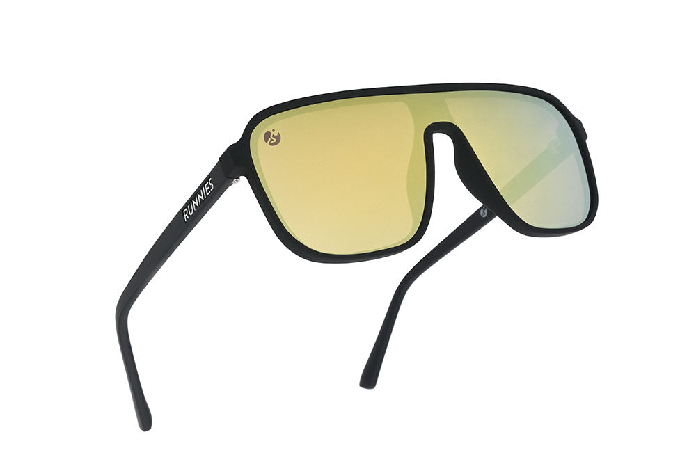 Pure luxury unleashed. Black frames with liquid gold mirror lenses